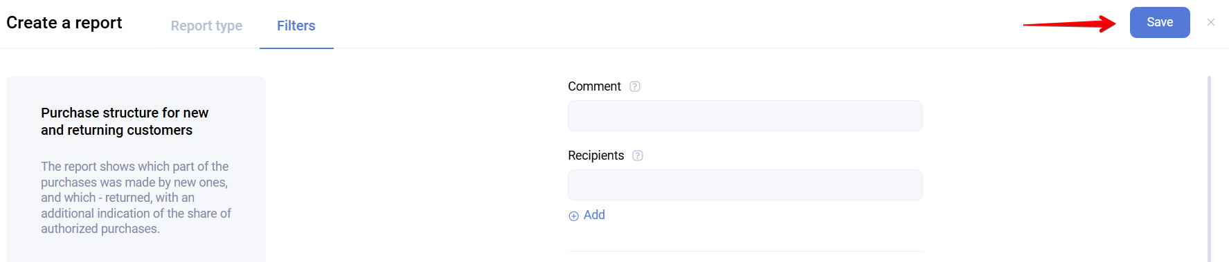 - Recipients - allows you to specify recipients for a recurring report. When the report is generated, a notification will be sent to the specified email addresses.