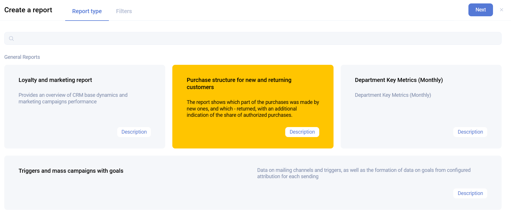 To generate a new report, click Request report, select the required report, and click Next.