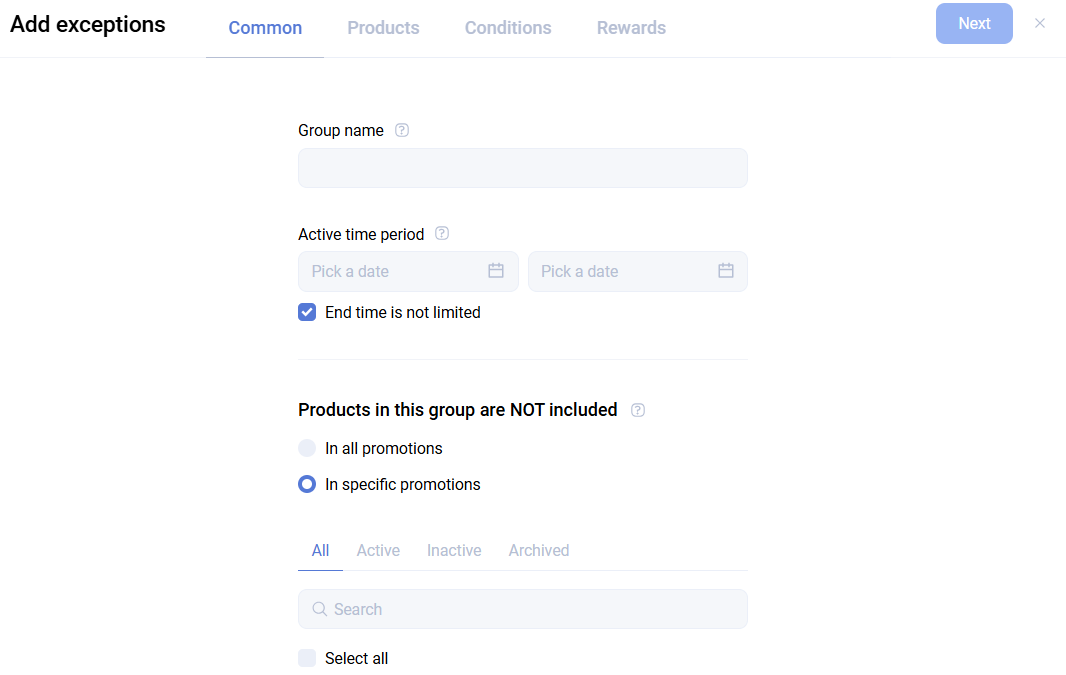 At the second step, define the products covered by the exclusion. Products can be selected: