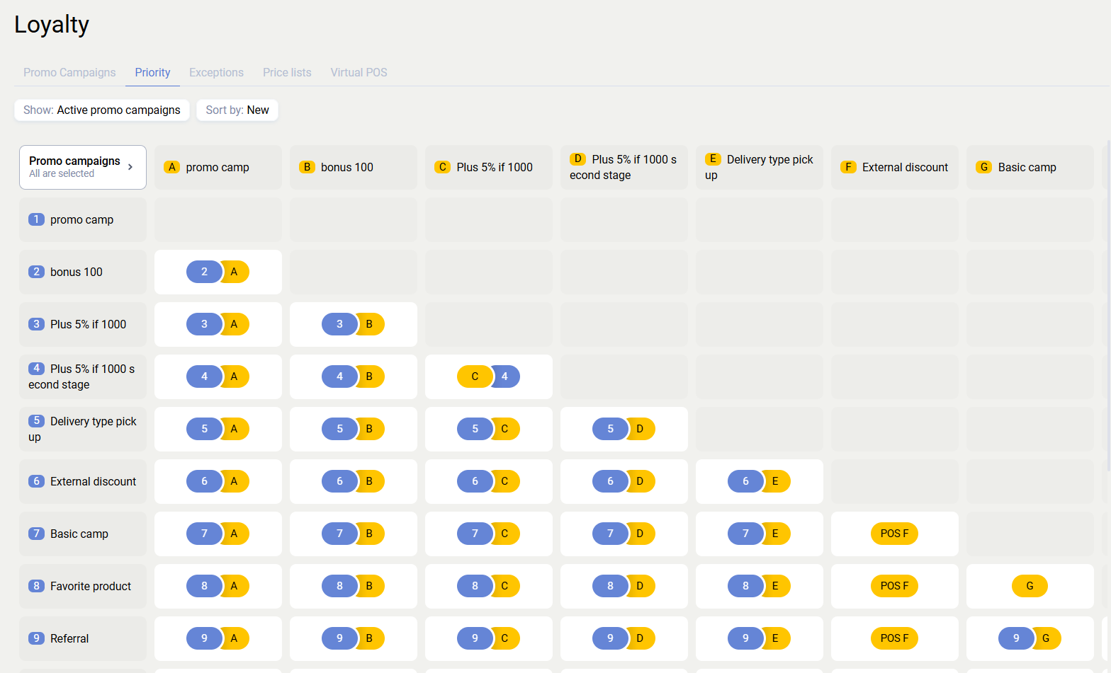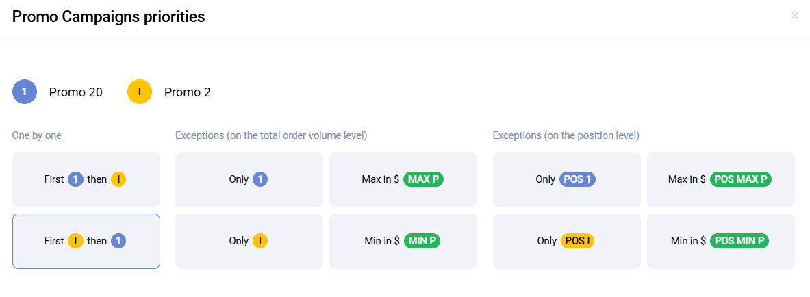 In addition, the priority matrix for all promotions is available in the Priority subsection of Loyalty. There you can find any promotion pair and configure their mutual priority.