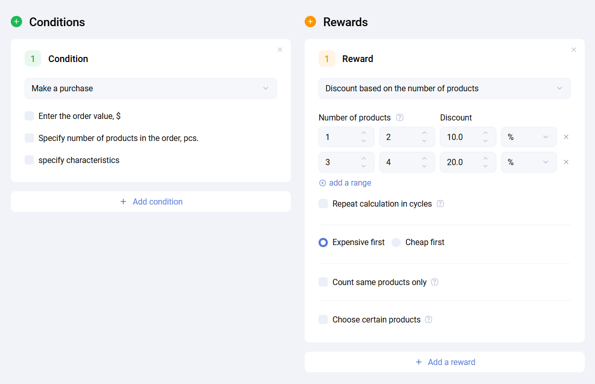 Discount by product quantity - lets you define the discount amount depending on the number of matching products. Any number of quantity ranges can be configured. Products can be selected using the same methods as in the Buy a product condition block. The discount can be specified in percent or rubles, with an optional cap.
