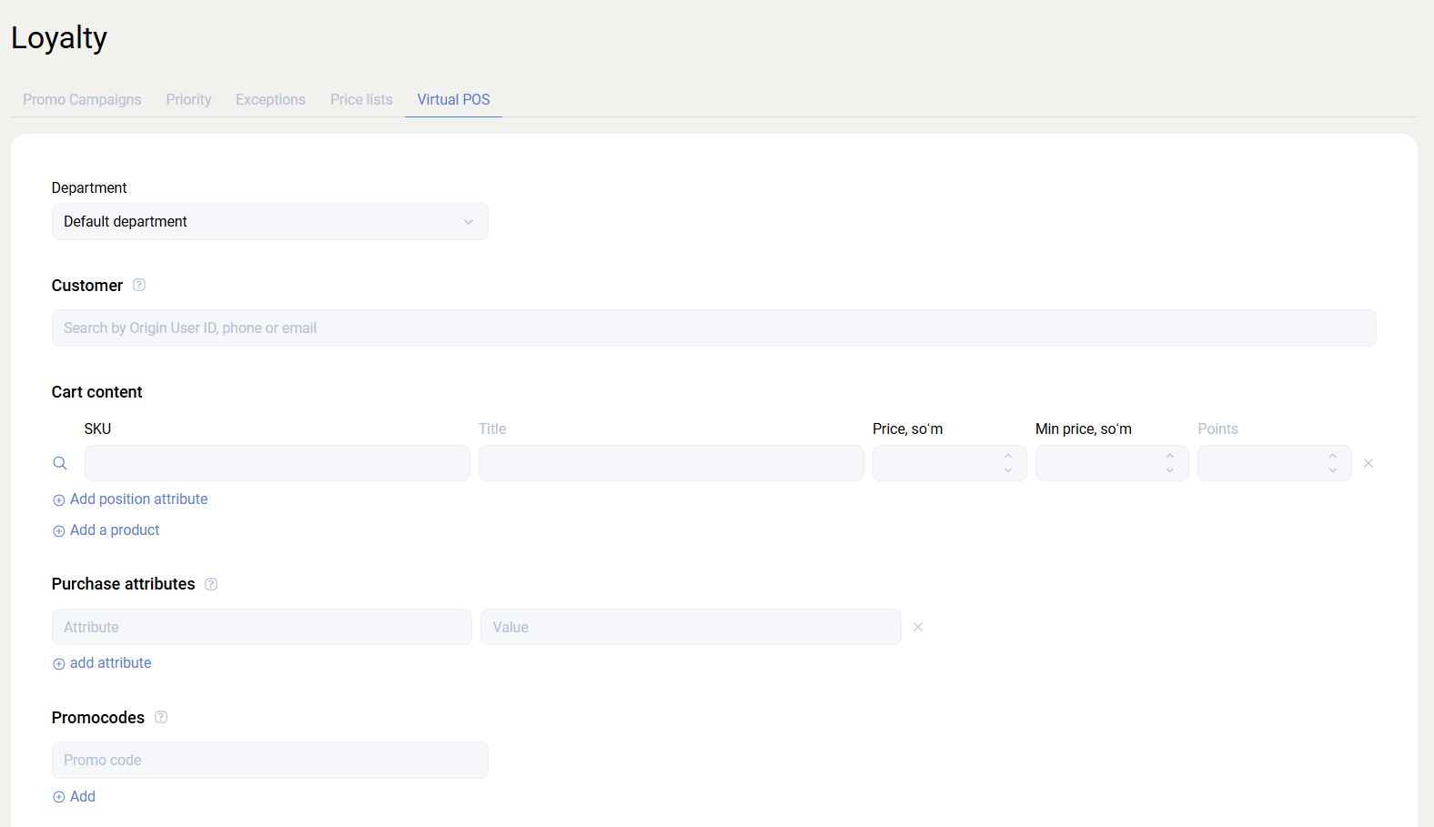 This tool is used to test promotion application while taking into account the department, client, promocode, purchase attributes, and position attributes. In practice, it emulates the behavior of the cart discount calculation method.